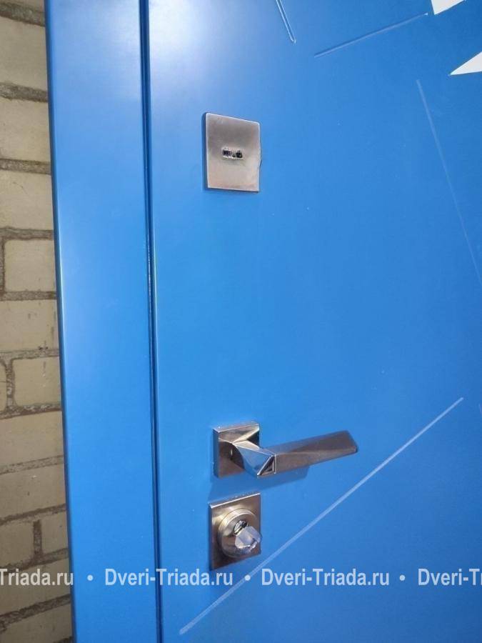 Входная дверь с остекленной фрамугой и терморазрывом (синие панели МДФ RAL) Арт-616