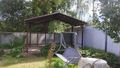 Навес двускатный из коричневого профнастила для зоны отдыха на даче Арт-696